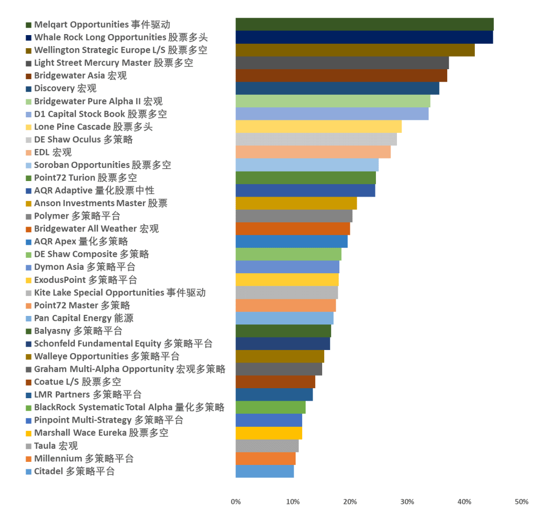 DE Shaw Oculus、ExodusPoint、Millennium、Citadel、P72等頭部平臺(tái)型基金管理人均實(shí)現(xiàn)兩位數(shù)正收益,而我們?cè)谌ツ曛靥峒暗腤alleye與Dymon也再次斬獲佳績。