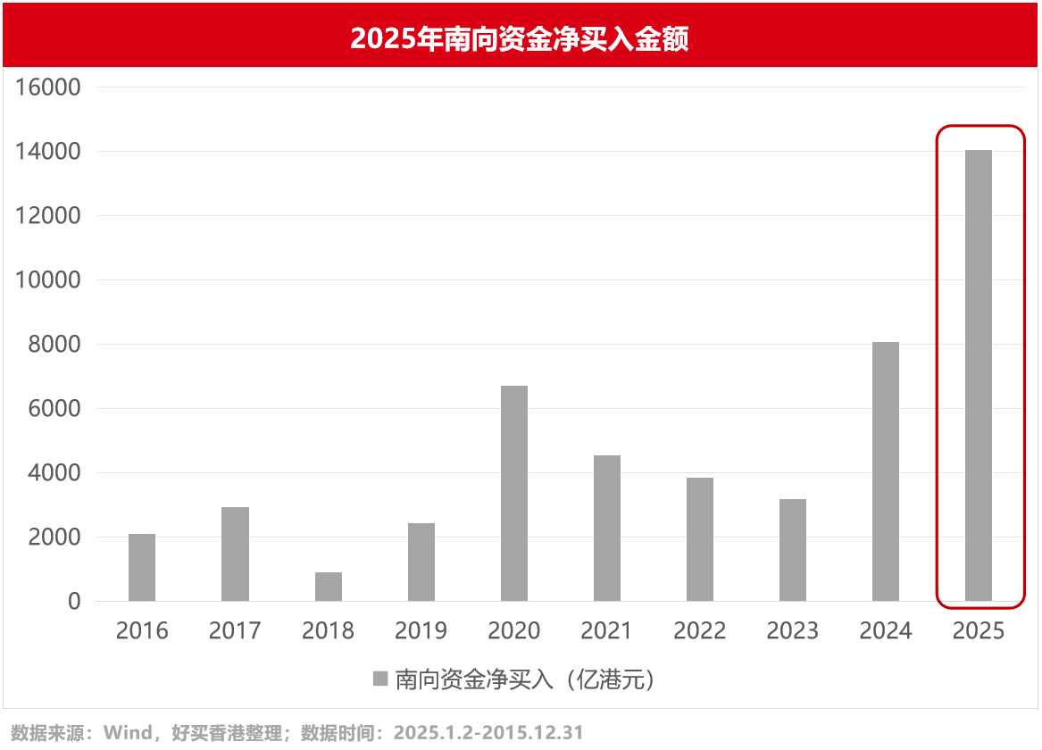 2025年以來,港股成為內地資金的重要配置方向。據數據統(tǒng)計,2025年南向資金全年成交凈買入超1.4萬億港元,較2024年增長約73%,創(chuàng)下歷史新高。隨著南向資金規(guī)模的不斷擴大,內地資金逐步成為港股市場的中流砥柱,這意味著其對市場風格、行業(yè)輪動和個股表現的影響力正不斷增強。