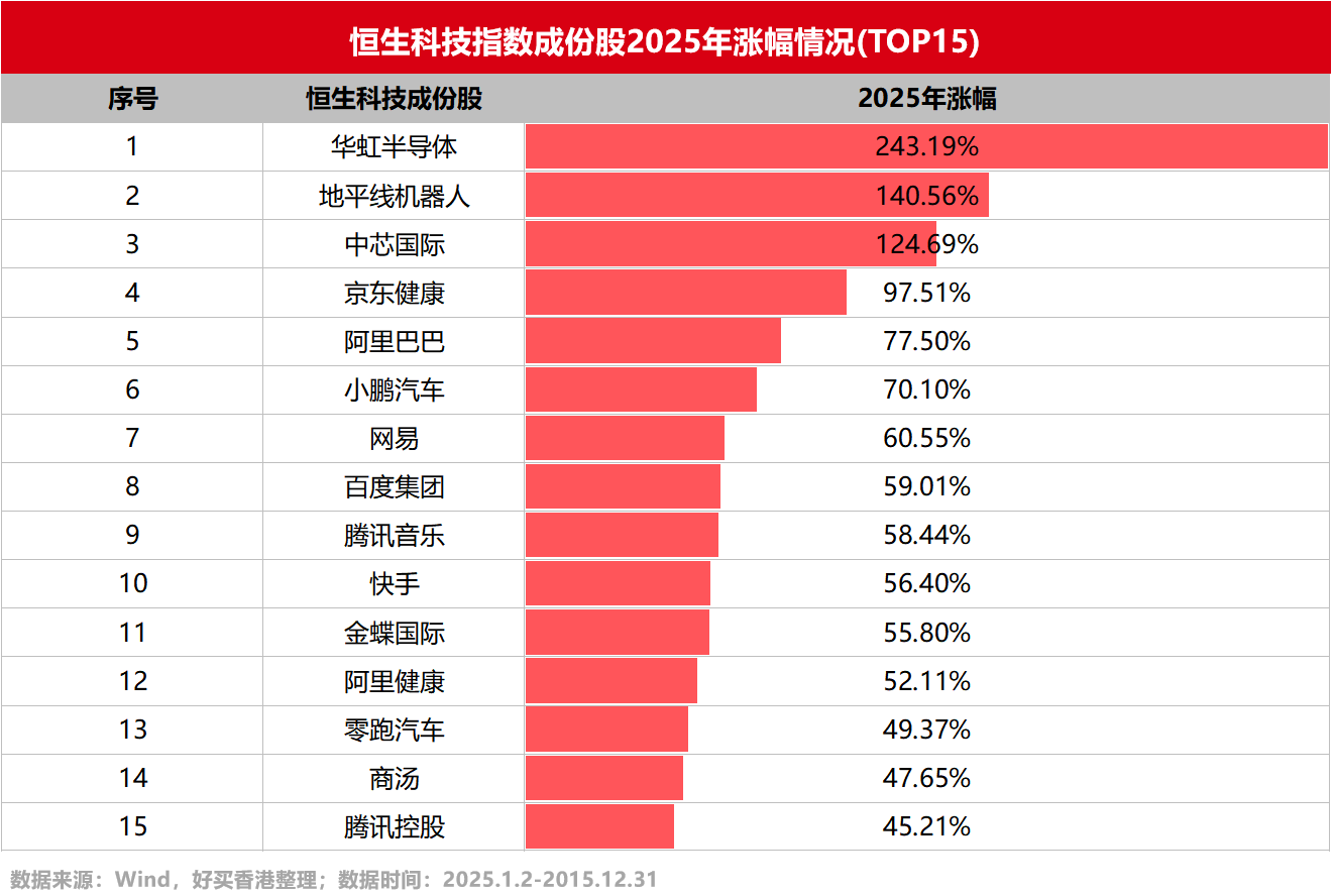 過往幾年,港股市場一直被視為全球資本市場的“估值洼地”。但是2025年以來,中國科創(chuàng)力量與科技股的價值重估,推動港股市場持續(xù)走強。在30只恒生科技指數成份股中,有22只個股上漲,其中第一梯隊,包含半導體制造與核心AI芯片(華虹、中芯、地平線),年度漲幅超100%。