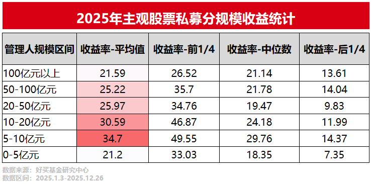 而且,由于量化私募具有較強(qiáng)的頭部效應(yīng),大型管理人在人才、硬件、技術(shù)、細(xì)節(jié)精度、策略多元性等方面更易形成優(yōu)勢(shì),所以量化股票私募2025年業(yè)績展現(xiàn)出越大越強(qiáng)的現(xiàn)象,百億量化私募的平均業(yè)績水平領(lǐng)先于中小量化私募。