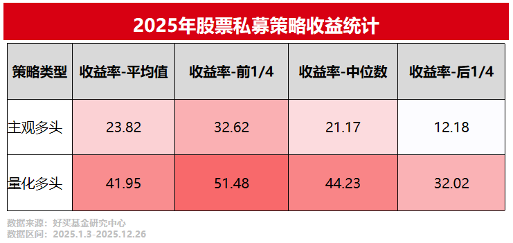 由上表可見,受市場(chǎng)環(huán)境影響,2025年量化多頭策略業(yè)績的平均值與中位值均強(qiáng)于主觀多頭策略。但主觀多頭私募的業(yè)績離散度更大,這體現(xiàn)在業(yè)績前1/4與業(yè)績后1/4分位點(diǎn)的差距上,也就是說主觀多頭私募可能有更多的爆發(fā)點(diǎn),但坑或許也不少。